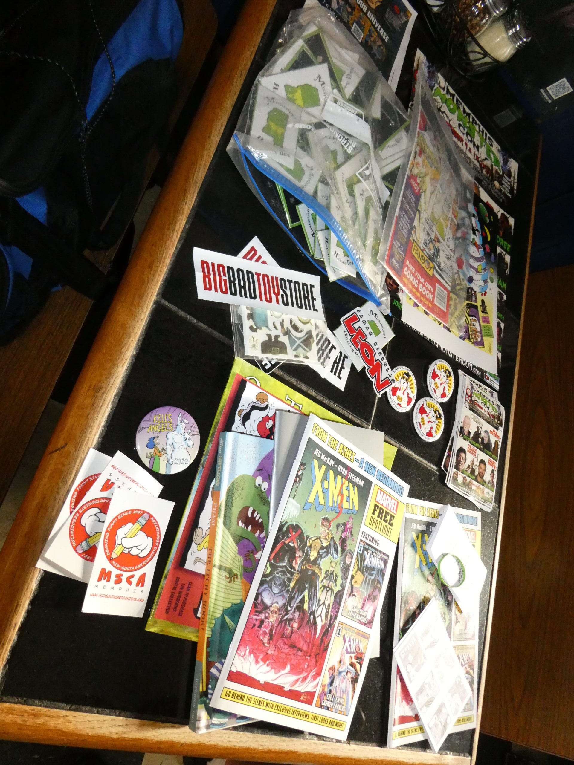 Each year we have great submissions for the annual art swap, and each monthly dinner we’ve also been known to have some fun freebies for our dinner guests to enjoy.  Be sure to help yourself to anything on the giveaway table, or bring any promos you’d like to share with the group.  Lots of stickers, buttons, comics, business cards, and more can be shared. Occasionally we’ll have candy or snackies to enjoy, too.  This month should be no exception!