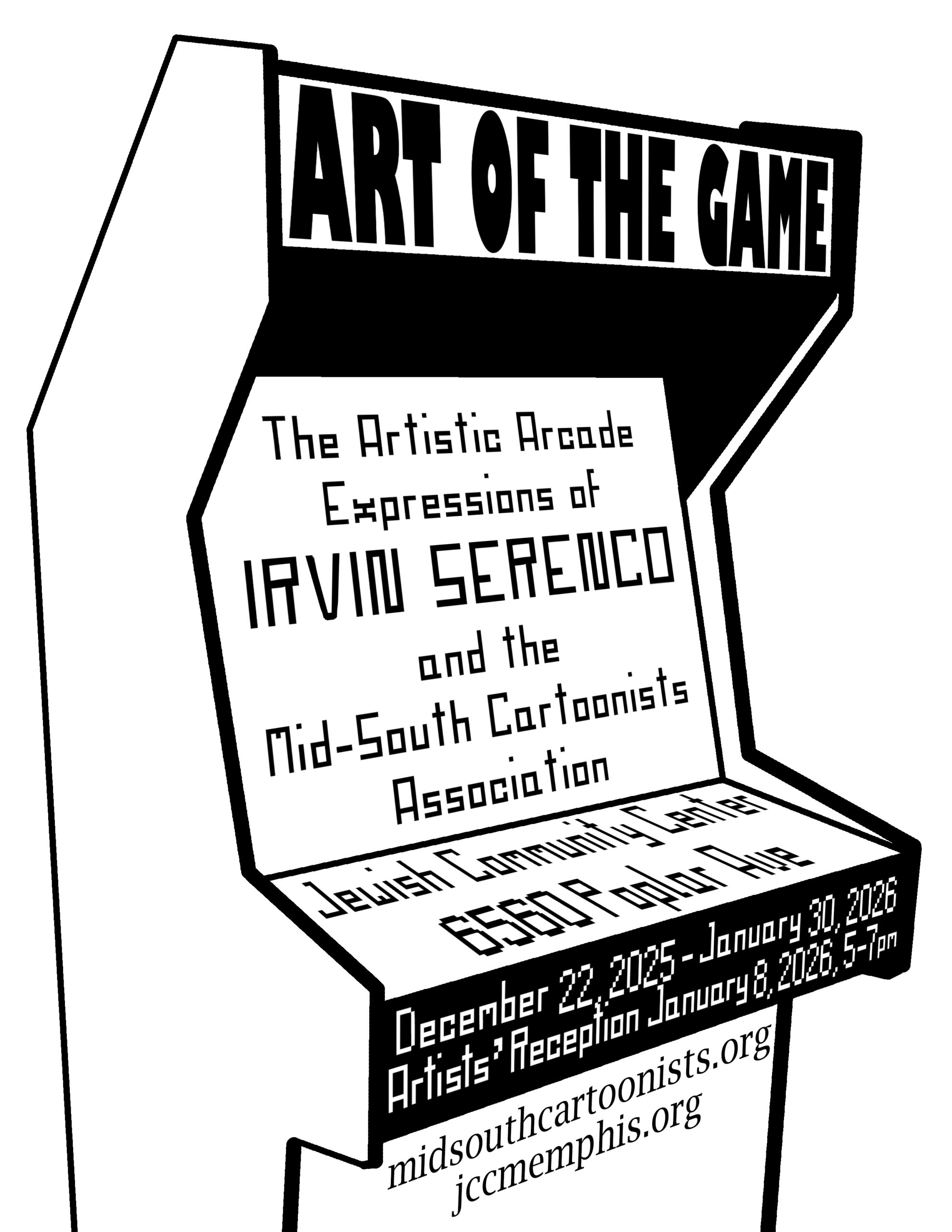 GAME ON! Come play with me and the Mid-South Cartoonists Association as we celebrate games in our collaborative art show, “Art of the Game,” with an art presentation in memory of Irvin Serenco. It promises to be a fun time! You can see the art during open business hours of the Jewish Community Center at 6560 Poplar Ave, Memphis, TN, from December 22, 2025 – January 30, 2026. We will have an artists’ reception January 8, 2026, from 5 – 7 pm.